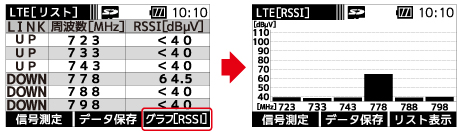 LTE(携帯電話サービス700MHz帯)のRSSI(受信信号強度)を測定できます。また、リストやグラフで表示することもできます。